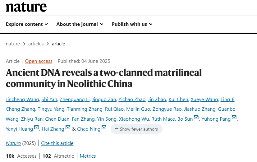 6月4日,Nature《自然》在线发表北京大学与山东省文物考古研究院联合开展的一项针对中国史前母系社会的重大研究成果,研究题为《古DNA研究揭示中国新石器时代双氏族母系社会》“Ancient DNA reveals a two-clanned matrilineal community in Neolithic China”。研究团队基于高分辨率古DNA亲缘关系鉴定技术,综合考古学、人类学、稳定同位素以及碳十四年代学等多学科交叉研究,首次在泰沂山北麓沿海地区、中华文明起源与早期发展的关键区域,实证确认了4750年前大汶口文化两个母系氏族构成的村落组织。