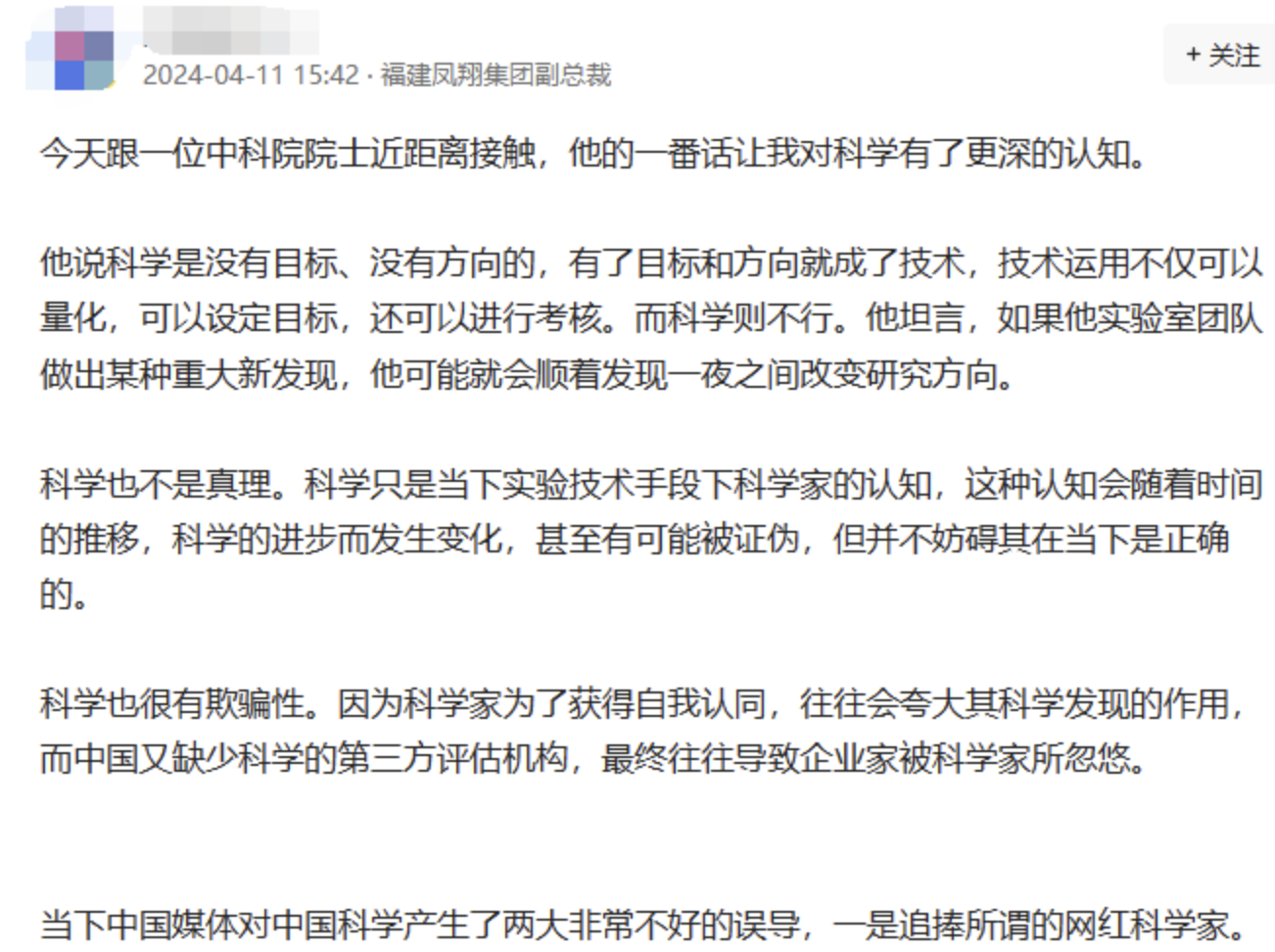 近日,福建凤翔集团副总裁江南客0591在与一位中科院院士的交流中获得了对科学本质的深刻洞察。这位院士的观点不仅挑战了人们对科学的常规理解,也引发了社会各界的广泛讨论。